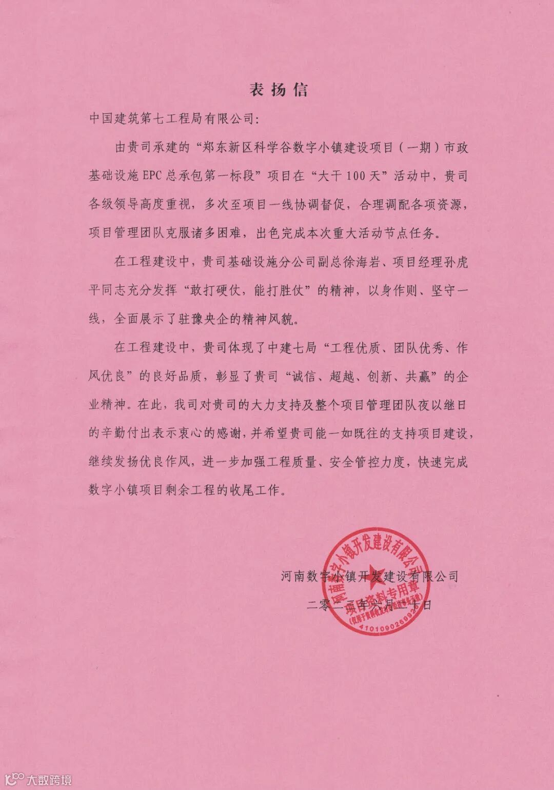 6月20日,基础设施分公司数字小镇市政项目在业主单位“大干100天”活动中取得优异成绩,获表扬信一封。