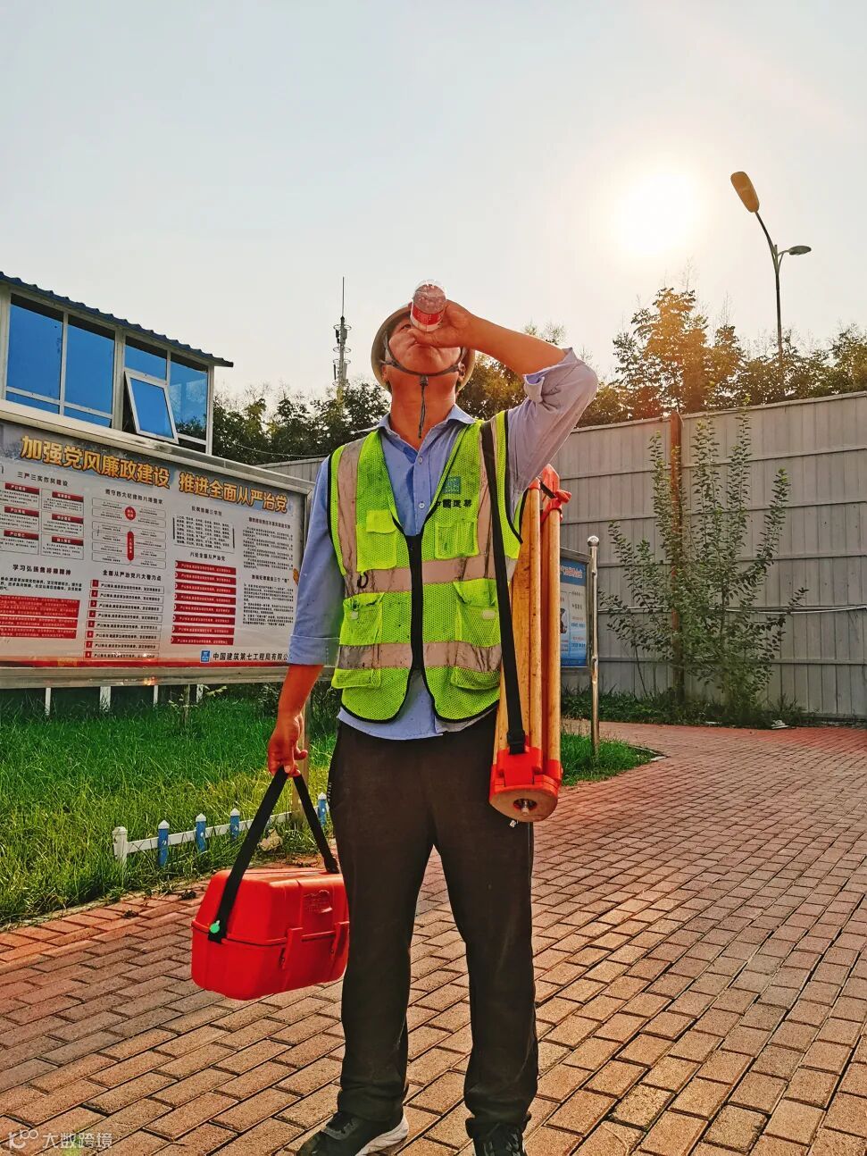 背着测量仪器从施工现场回到项目部,一口气喝完一瓶水,沁人心脾,恢复活力。