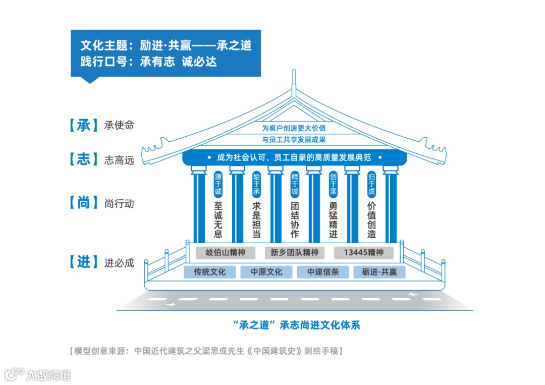 以“房屋、道路”为形象载体,构建“砺进·共赢——承之道房屋模型”,形成“承、志、尚、进”的文化理念体系。