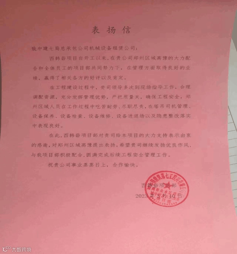 机械设备租赁公司郑州区域坚持高品质服务服务标准,积极配合项目做好设备安拆、进退场及安检和隐患整改监督工作,近日收获多封表扬信。