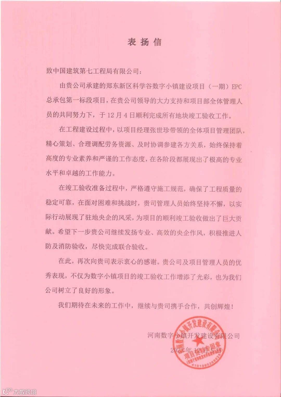 12月5日,分公司郑东新区科学谷数字小镇项目所有地块顺利通过五方责任主体竣工验收并收到业主表扬信。