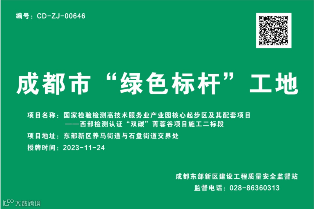 近日,分公司西部检测认证“双碳”菁蓉谷项目获评成都市“绿色标杆”工地。
