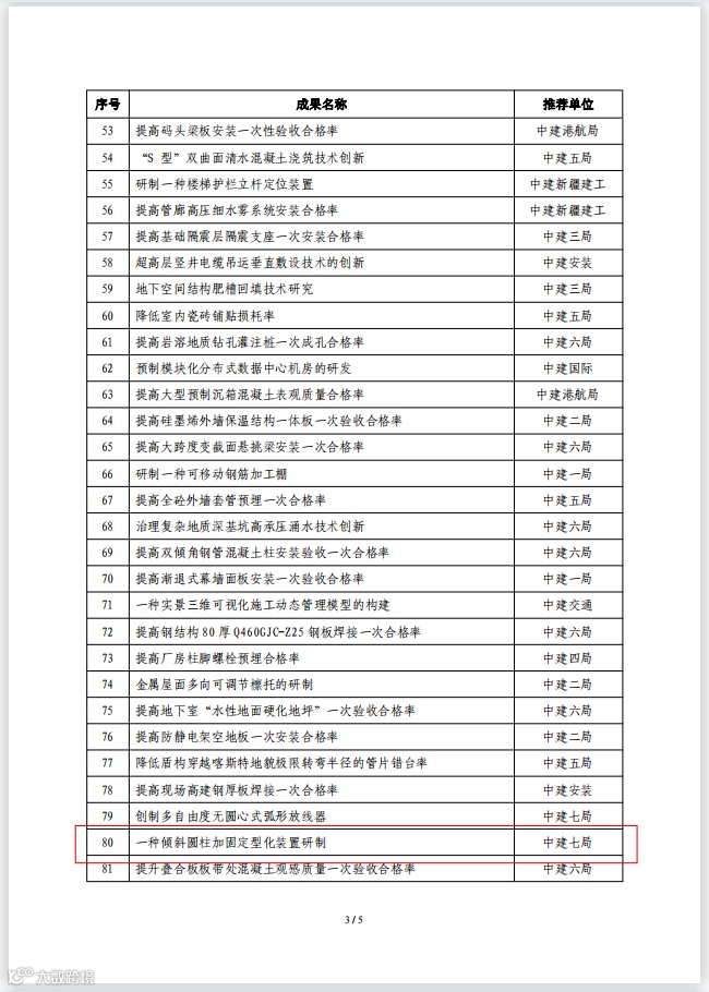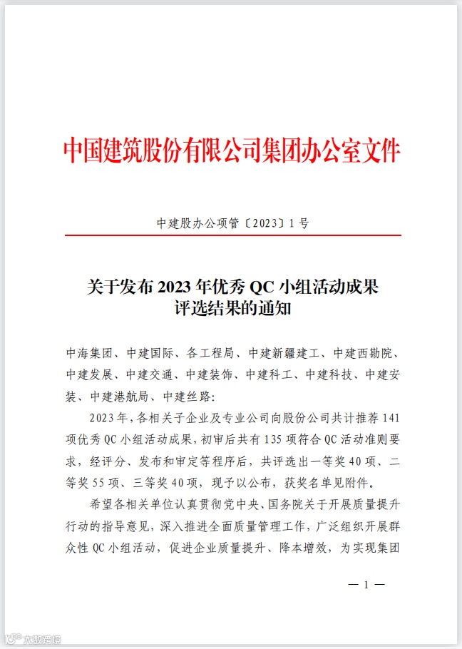 3月29日,郑州分公司中原科技城人才创业园项目课题《一种倾斜圆柱加固定型化装置研制》获评中建股份2023年优秀QC小组活动成果二等奖。