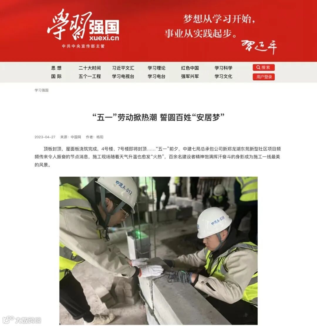 4月27日,学习强国刊文《“五一”劳动掀热潮 誓圆百姓“安居梦”》,报道河南分公司新郑龙湖东苑新型社区项目工地上,建设工人们坚守岗位、抢抓工期,以昂扬的奋斗者姿态迎接五一国际劳动节。