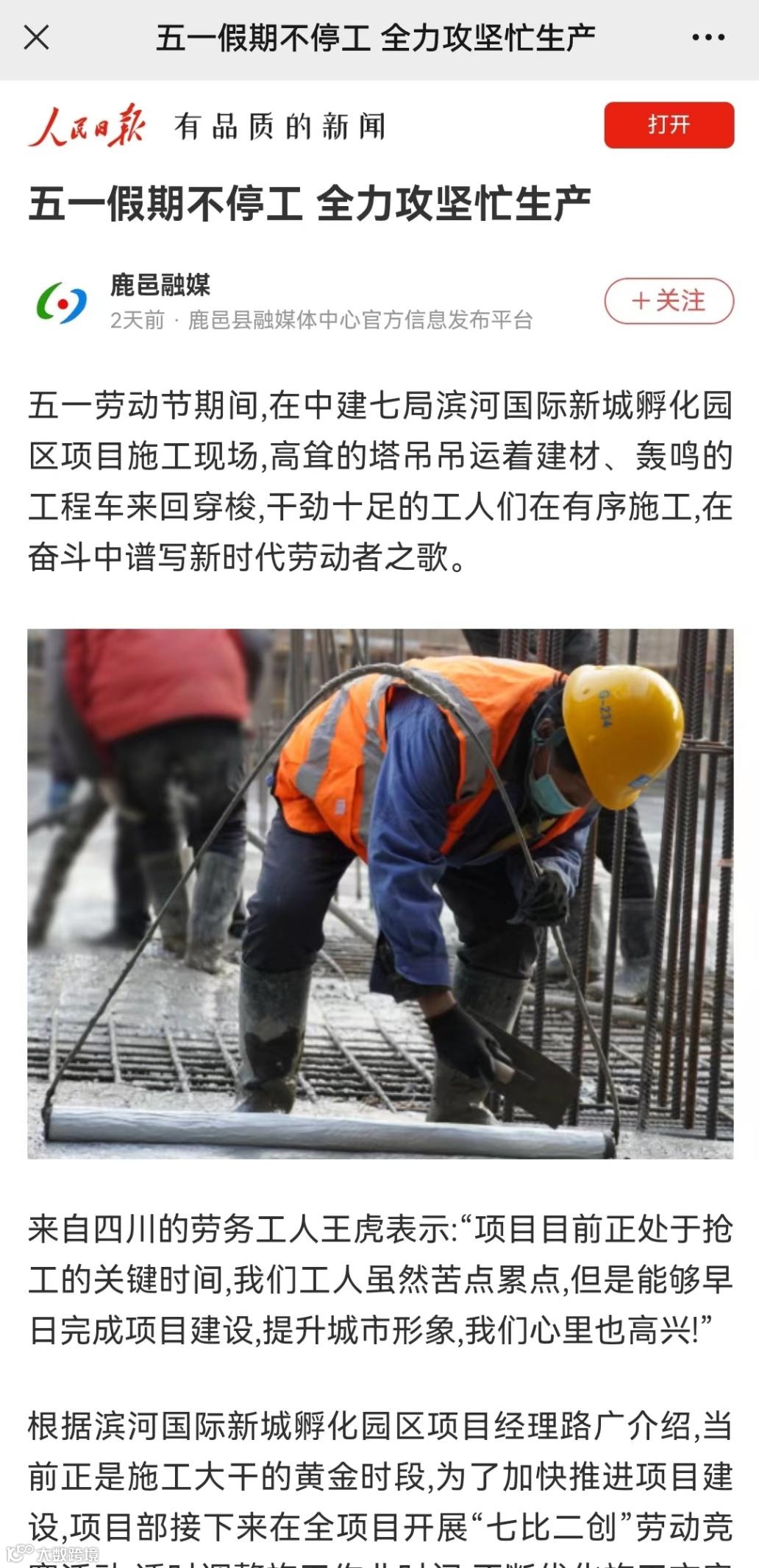 4月27日,人民日报客户端刊文《五一假期不停工全力攻坚忙生产》,报道五一期间,郑州分公司滨河国际新城孵化园区项目施工现场,高耸的塔吊吊运着建材、轰鸣的工程车来回穿梭,干劲十足的工人们在有序施工,在奋斗中谱写新时代劳动者之歌。