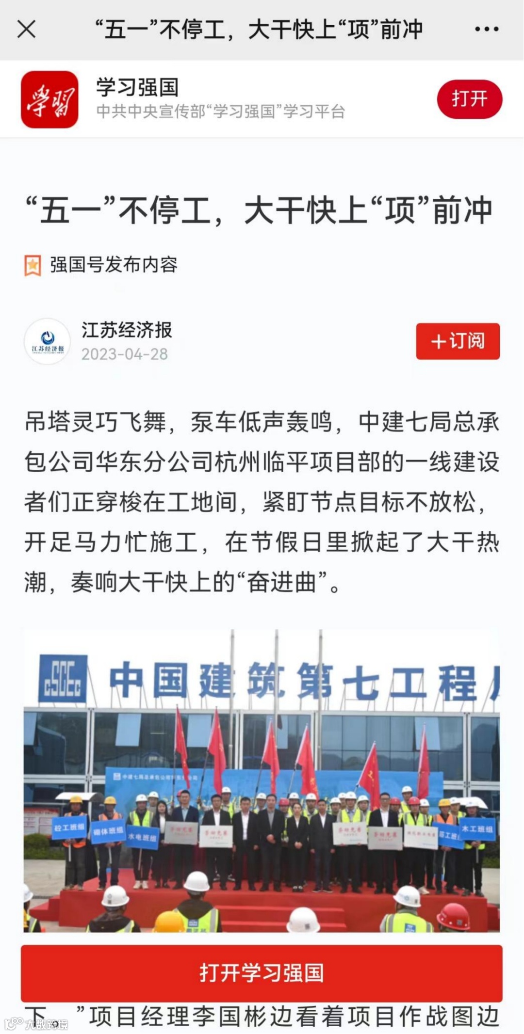 4月28日,学习强国刊文《“五一”不停工,大干快上“项”前冲》,报道华东分公司杭州临平项目工地上,一线建设者们紧盯节点目标不放松,开足马力忙施工,在“五一”劳动节掀起了大干热潮,奏响大干快上的“奋进曲”。