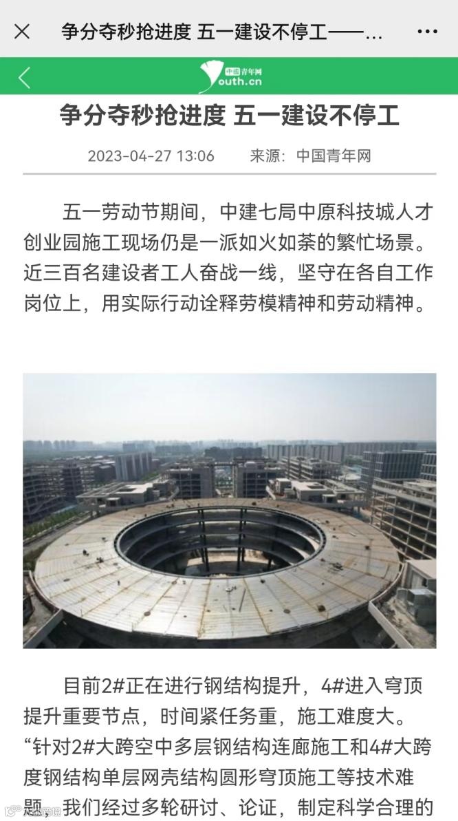 4月27日,中国青年网刊文《争分夺秒抢进度 五一建设不停工》,报道郑州分公司中原科技城人才创业园项目工地上一派如火如荼的繁忙场景,近三百名建设者工人奋战一线,坚守在各自工作岗位上,用实际行动诠释劳模精神和劳动精神。