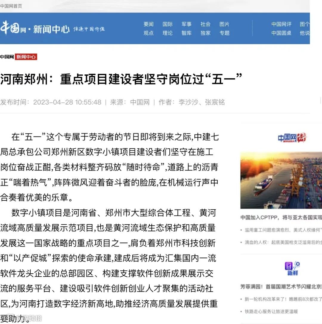 4月28日,中国网刊文《河南郑州:重点项目建设者坚守岗位过“五一”》,报道五一期间,河南分公司数字小镇项目建设者们坚守在施工岗位奋战正酣,各类材料整齐码放“随时待命”,道路上的沥青正“喘着热气”,阵阵微风迎着奋斗者的脸庞,在机械运行声中合奏着优美的乐章。