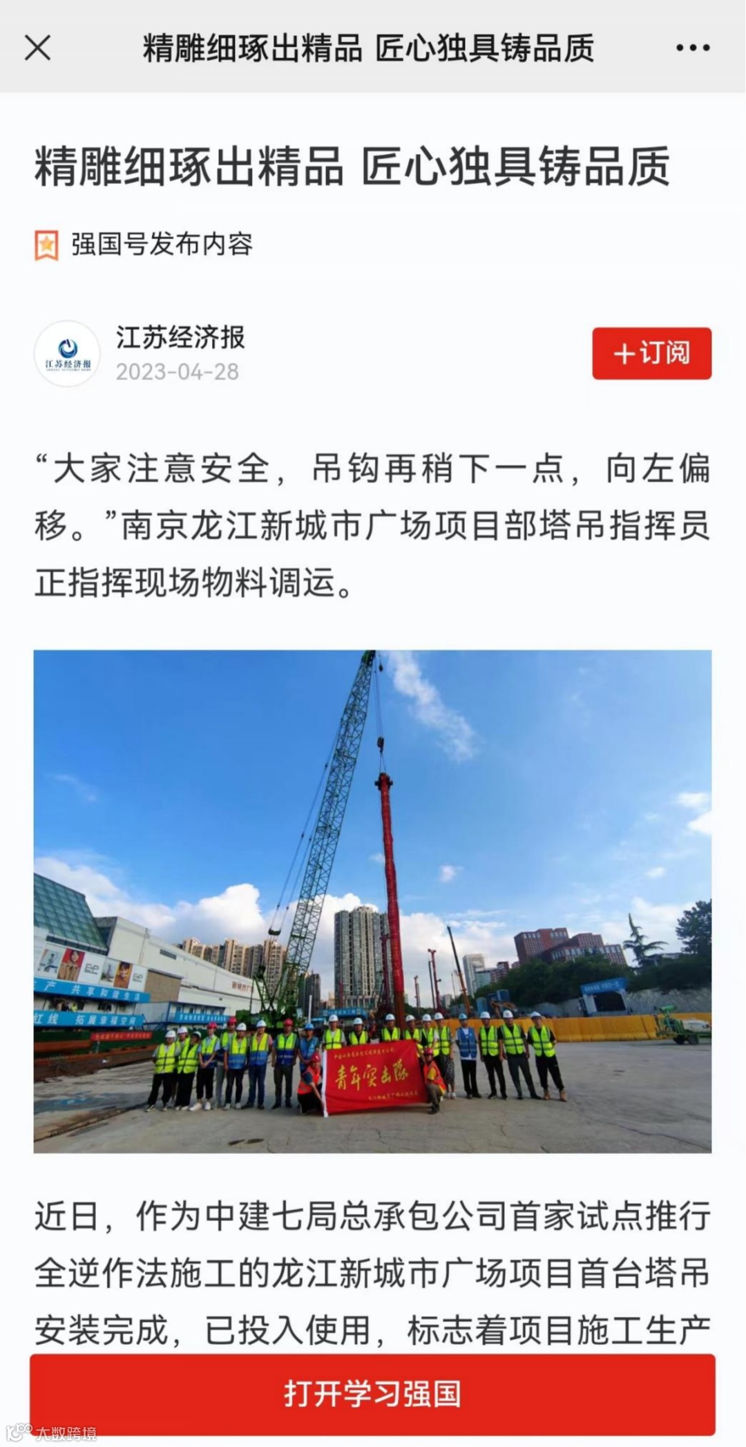 4月28日,学习强国刊文《精雕细琢出精品 匠心独具铸品质》,报道华东分公司龙江新城市广场项目部管理人员及劳务工友用匠心致初心,凝心聚力,铆足干劲,全力推进项目建设。