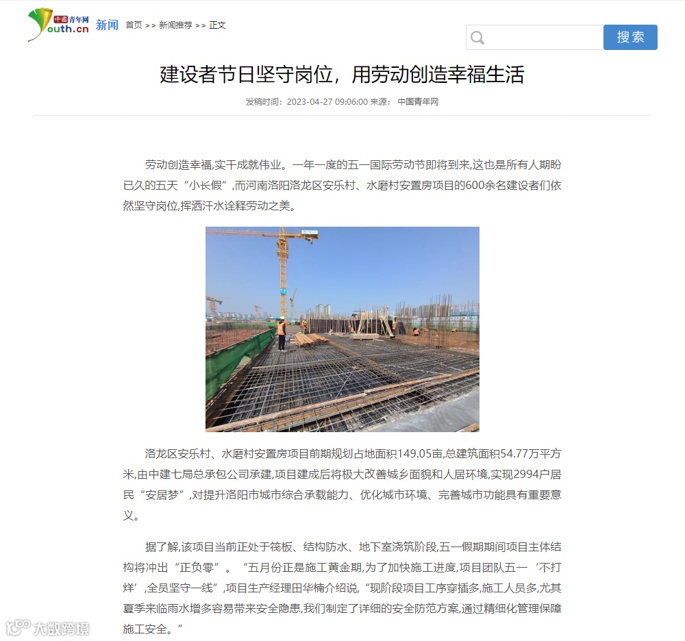 4月27日,中国青年网刊文《建设者节日坚守岗位,用劳动创造幸福生活》,报道河南分公司洛龙区安乐村、水磨村安置房项目的600余名建设者们坚守岗位,通过挥洒汗水诠释劳动之美。