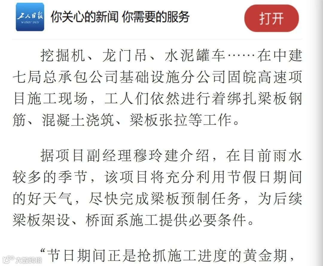 4月28日,《工人日报》客户端刊文《“五一”不停工 劳动庆佳节》,报道基础设施分公司固皖高速公路项目把握“五一”施工黄金期,全力抢工期、保节点,项目施工大干快上的场面。