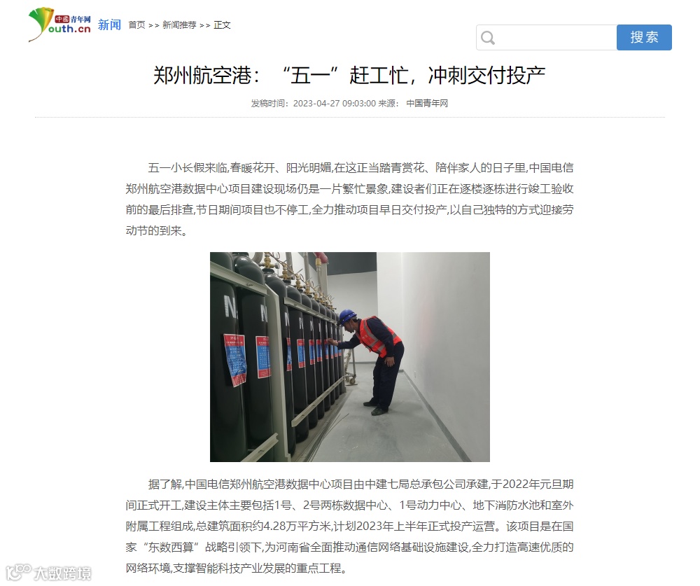 4月27日,中国青年网刊文《郑州航空港:“五一”赶工忙,冲刺交付投产》,报道河南分公司中国电信郑州航空港数据中心项目建设现场的繁忙景象,建设者们逐楼逐栋进行竣工验收前的最后排查,全力推动项目早日交付投产,以独特的方式迎接劳动节的到来。