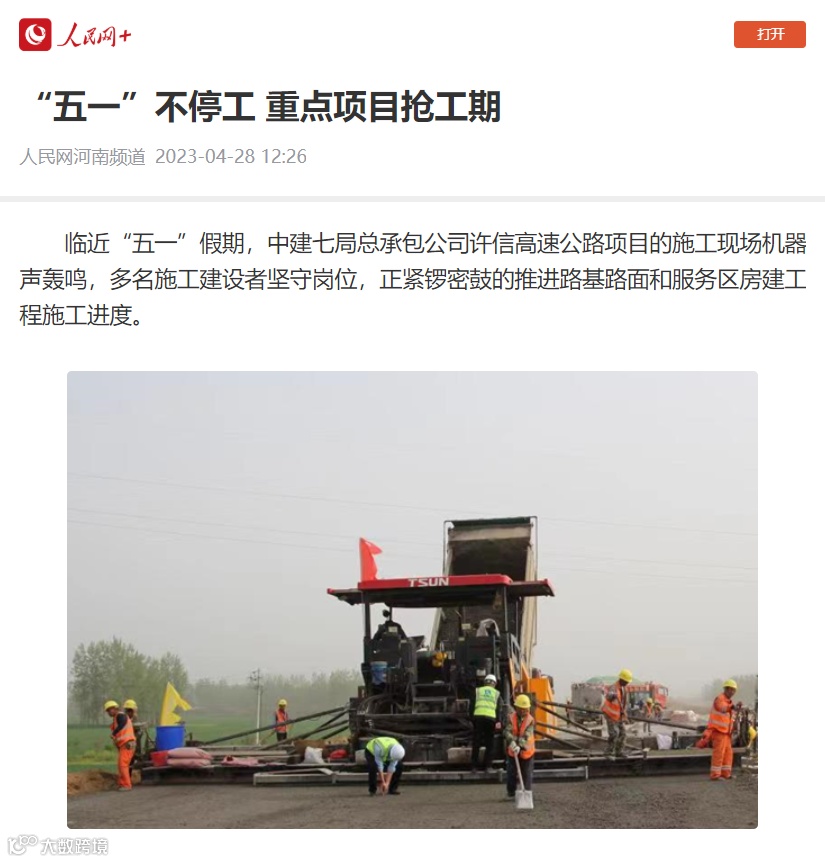4月28日,人民网刊文《“五一”不停工 重点项目抢工期》,报道基础设施分公司许信高速公路项目多名施工建设者在“五一”期间坚守岗位,他们锣密鼓的推进重点工序建设,为早日完成通车目标打下坚实基础。