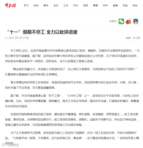 9月28日,中工网刊文《“十一”假期不停工 全力以赴拼进度》,报道基础设施分公司许信高速、固皖高速等河南省重点高速项目建设者在节日期间坚守一线岗位,抢抓金秋、主动作为,全力以赴推进工程施工进度,争取项目早日建成投运。
