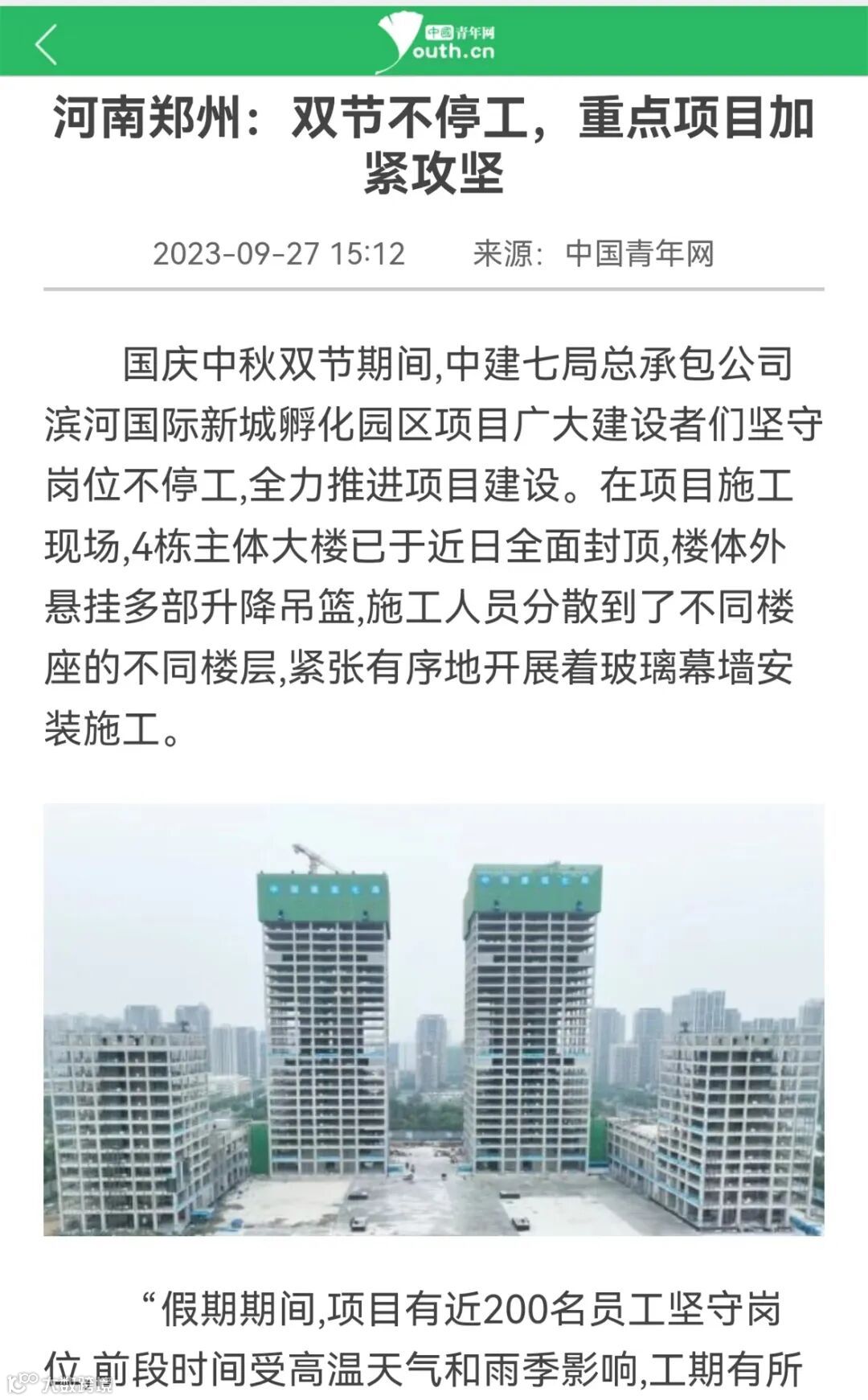 9月27日,中国青年网刊文《河南郑州:双节不停工,重点项目加紧攻坚》,报道国庆中秋双节期间,郑州分公司滨河国际新城孵化园区项目广大建设者们坚守岗位不停工,全力推进项目建设。