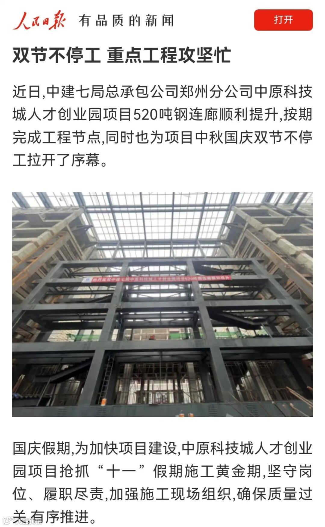 9月28日,人民日报客户端刊文《双节不停工 重点工程攻坚忙》,报道郑州分公司中原科技城人才创业园项目为加快项目建设,抢抓“十一”假期施工黄金期,坚守岗位、履职尽责,加强施工现场组织,确保质量过关,有序推进。