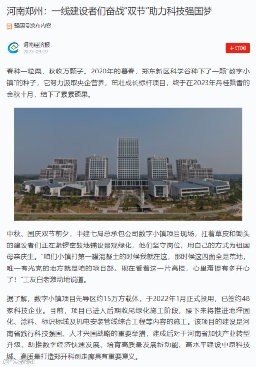 9月27日,学习强国平台刊文《河南郑州:一线建设者们奋战“双节”助力科技强国梦》,报道了河南分公司数字小镇项目建设者们坚守岗位,奋战“双节”冲刺完成收尾工程,确保项目年底顺利交付。
