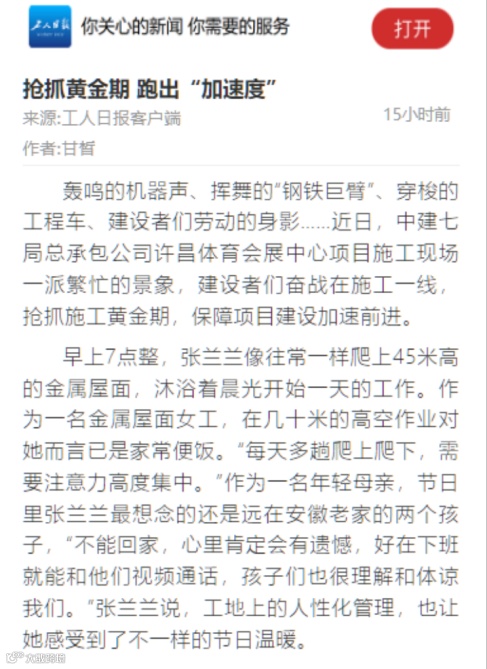 10月5日,工人日报客户端刊文《抢抓黄金期 跑出“加速度”》,报道河南分公司许昌体育中心项目一线建设者们在“双节”假期期间坚守岗位,铆足干劲加快施工进度。