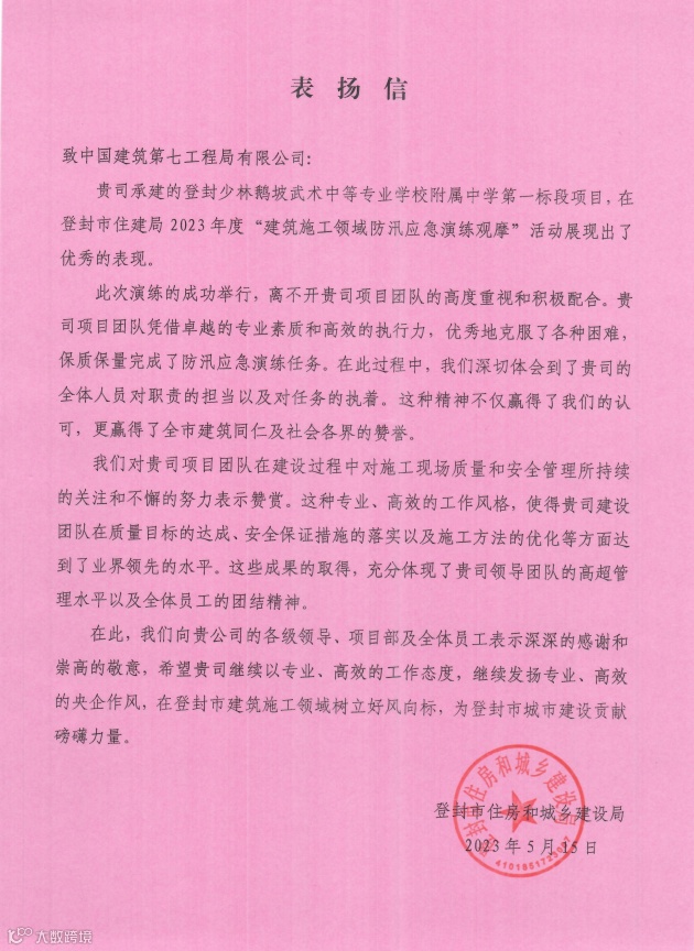 因在2023年度“建筑施工领域防汛应急演练观摩”活动中表现优秀,5月16日,河南分公司登封鹅坡武校项目获登封市住建局致信表扬。