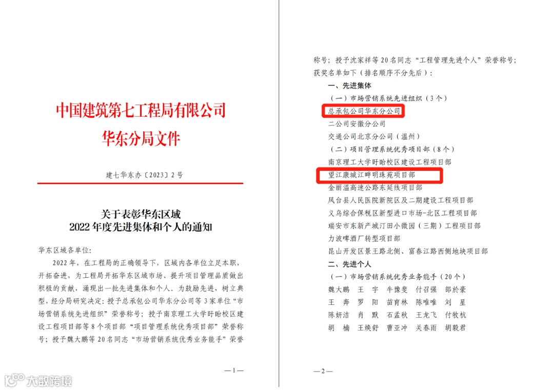 近日,华东分公司获评局华东区域2022年度市场营销体系先进组织,分公司望江康城江畔明珠苑项目部被评为项目管理系统优秀项目部。