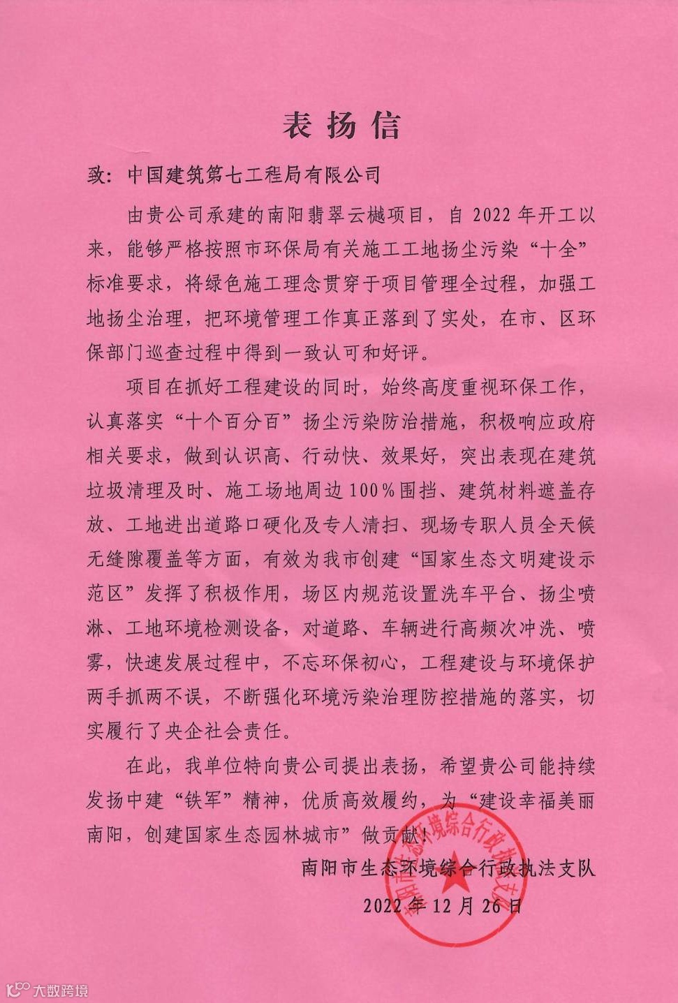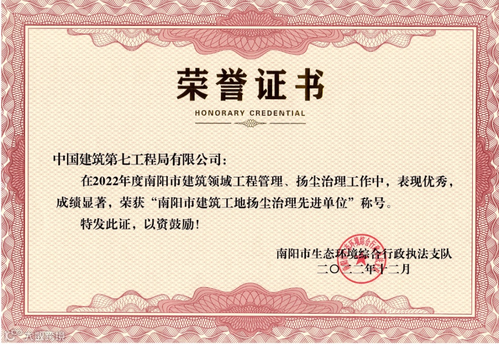 12月26日,郑州分公司南阳翡翠云樾项目荣获“南阳市建筑工地扬尘治理先进单位”称号,荣获政府表扬信一封,负责人杨军荣获“南阳市建筑领域工程管理先进个人”称号。