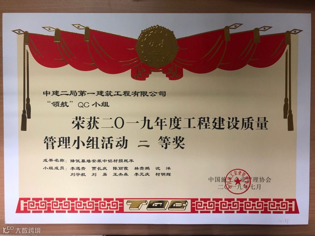 国资委国家央企发表赛二等奖(机场六期领航城领逸大楼项目“领航”QC小组-降低幕墙安装中铝材损耗率)。