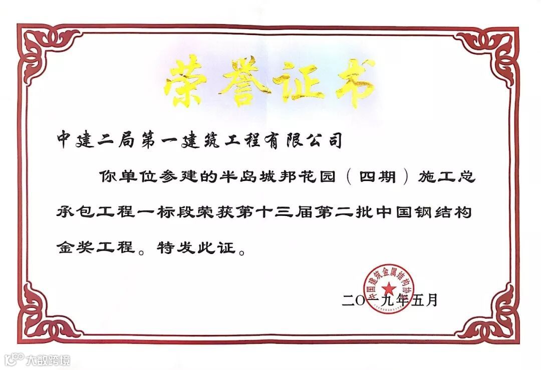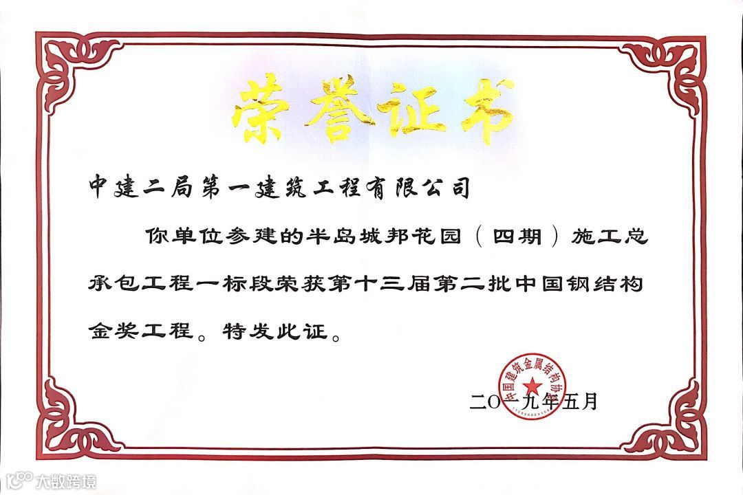 半岛城邦花园(四期)施工总承包工程一标段荣获第十三届第二批“中国钢结构金奖工程”。