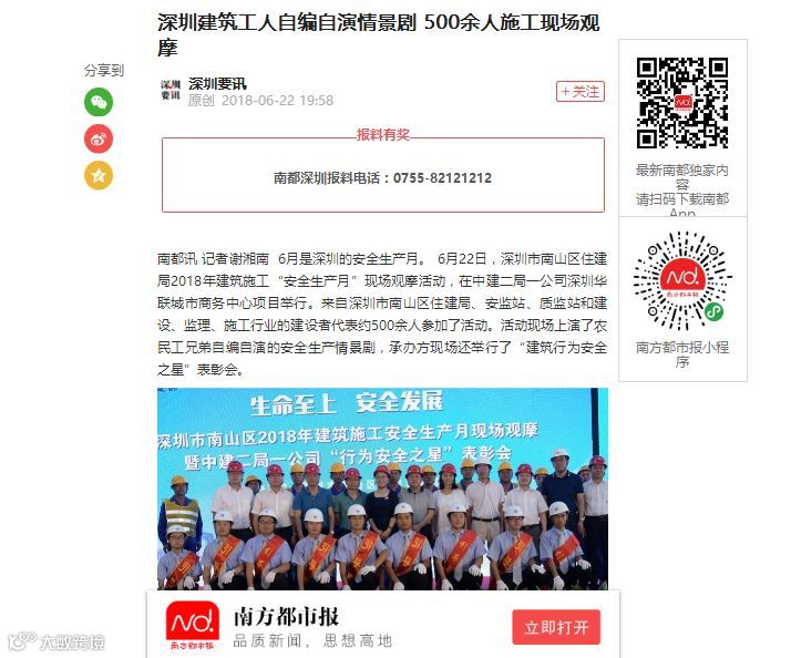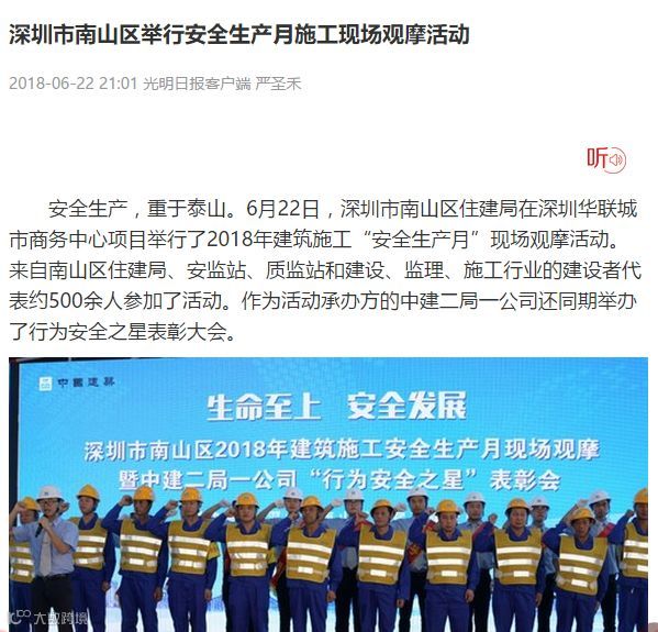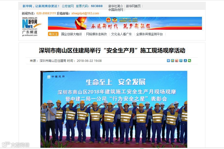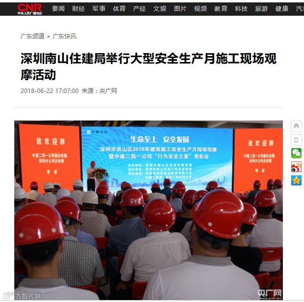 截至今日,深圳市南山区住建局2018年建筑施工安全生产月现场观摩暨中建二局一公司“行为安全之星”表彰会获得了众多媒体聚焦。