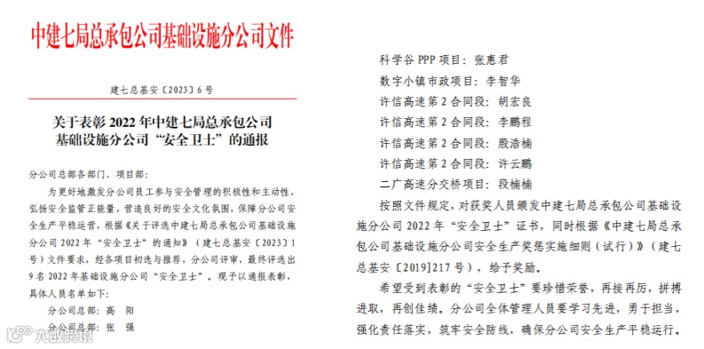 分公司开展2022年度安全评优评先工作,对分公司总部、项目部在安全管理工作方面表现突出的个人进行表彰,共评选出9名“安全卫士”,进一步激发项目安全管理工作的积极性、主动性,提升全员安全意识。