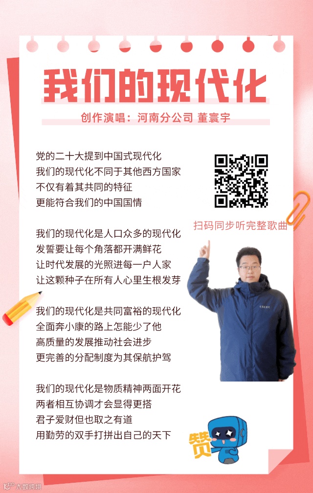 港区电信项目青年职工董寰宇创作说唱歌曲《我们的现代化》,通过青年群体喜闻乐见的方式,表达自己对“中国式现代化”的理解,以及对祖国繁荣富强、和谐美好的由衷祝福与赞美。歌曲积极进取、奋发向上、充满正能量,在分公司青年职工和工友中广泛传播。