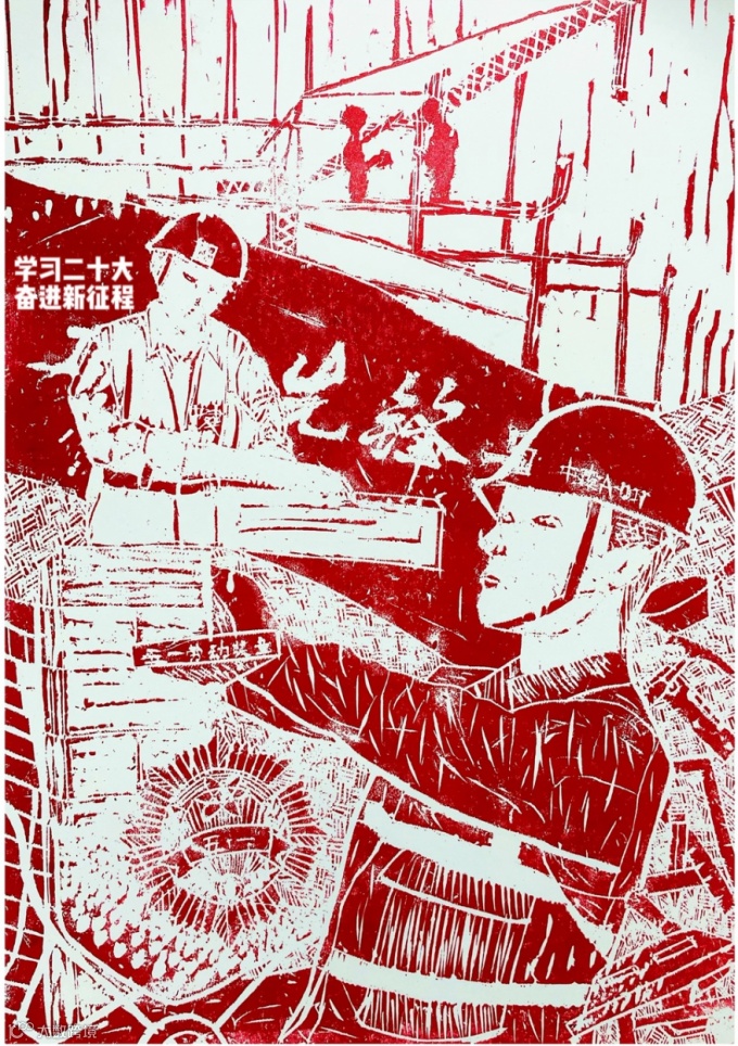 分公司员工徐欣悦以版画形式描绘出在党的领导下,新时代青年职工扎根一线、岗位建功的画面,展现了青年职工怀抱梦想又脚踏实地、敢想敢为又善作善成的优秀品质。