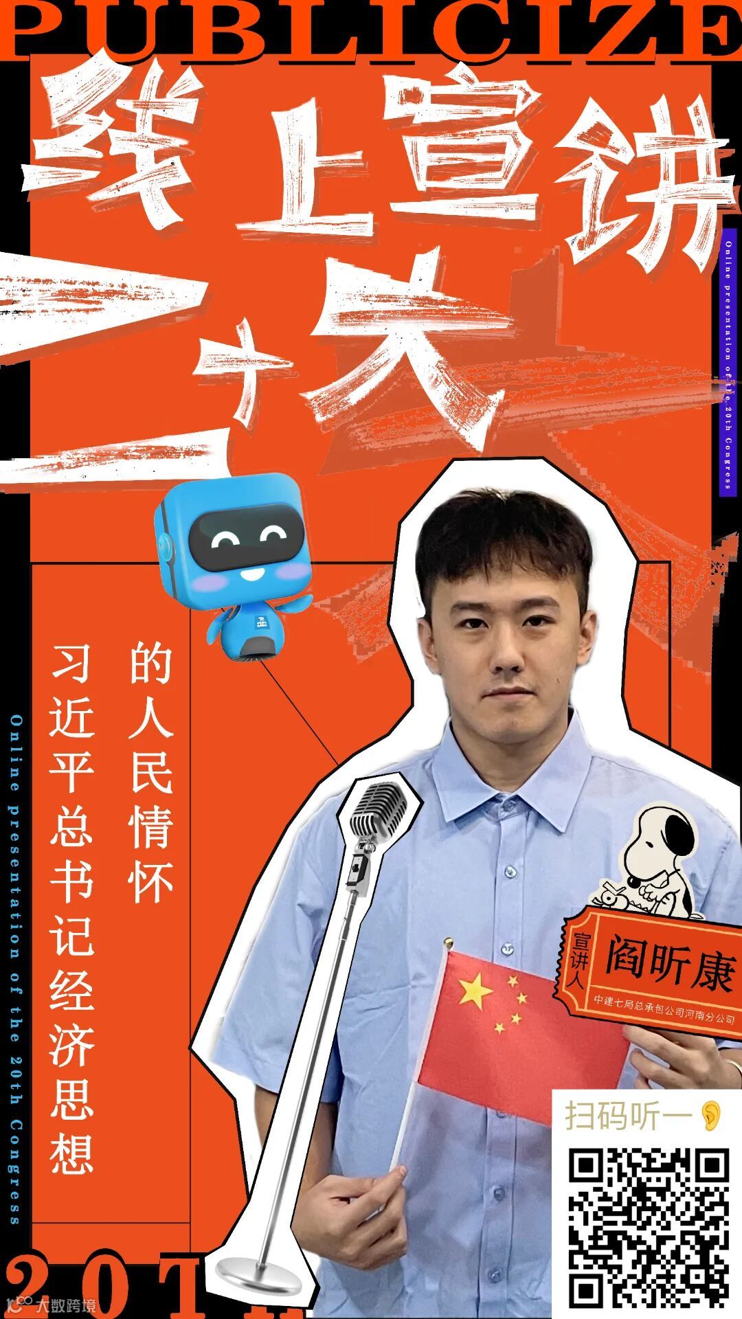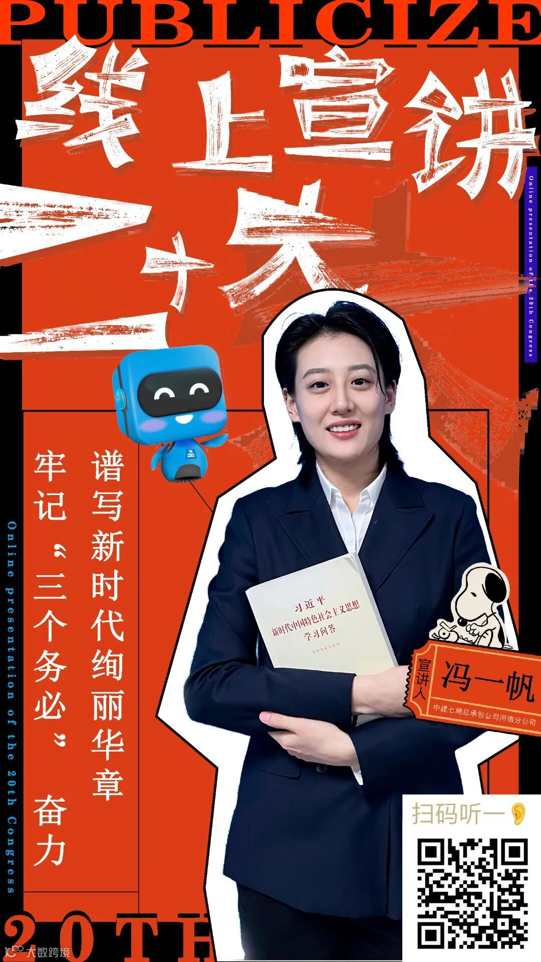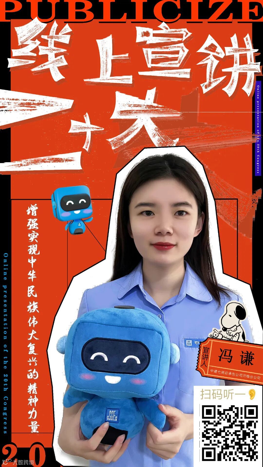 青年职工担任线上宣讲员,以通俗易懂的“腔调”、接地气的方式将官方语言变成通俗语言,把高深理论变成朴实道理,并将宣讲内容录制成音频,制作成二维码海报,将海报发至各项目、张贴在施工现场,方便职工工友随时随地“码”上学习。
