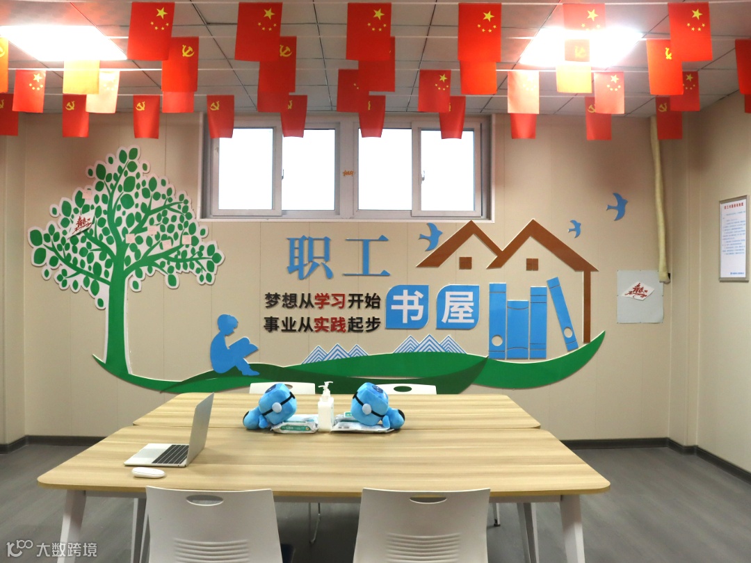 进入职工书屋,映入眼帘的是屋顶纵向排列的国旗,书屋墙壁覆盖艺术字,蓝绿色调为主的logo为书屋增添了些许春意。中间摆放着两张长桌,用于职工共享阅读经验,提供学习、交流的平台。一侧书柜陈列着党建、经济、法律、人生哲理、投资、专业技术、社会科学、名人传记、中外名著等多个门类的书籍2500余册、报刊200余期。另一侧书柜摆放着画笔、水粉,方便有绘画爱好的同事进行艺术创作。