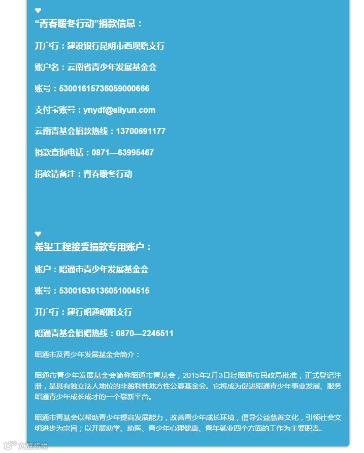 云南省昭通市青基会指定的账户中