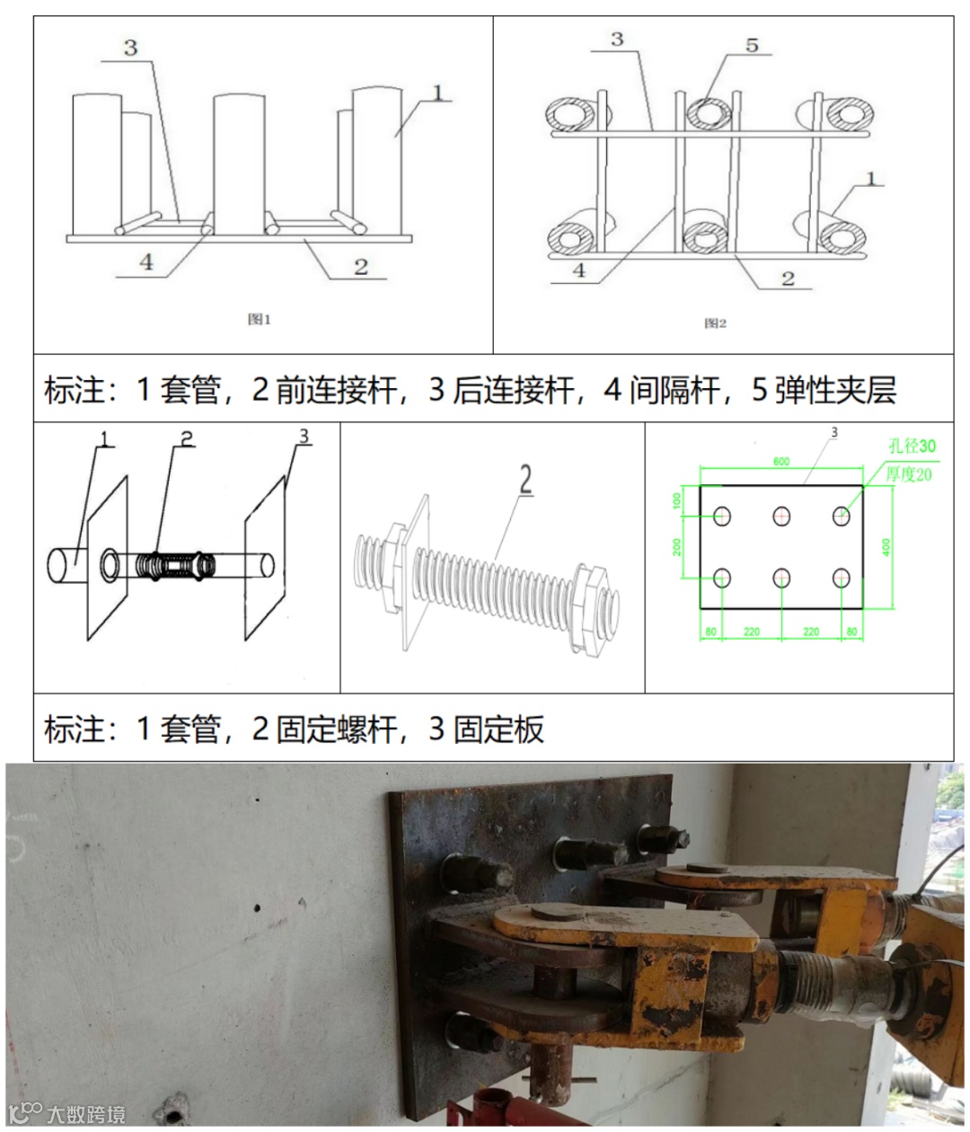 该成果是一种可重复利用的塔吊附着穿墙丝预埋孔装置,由多根垂直贯穿墙体的套管、连接杆、固定螺杆和固定板组成,工作原理为:在混凝土浇筑前,将此装置放于剪力墙内横竖钢筋交接处,套管初步固定在连接杆上,用固定螺杆穿入套管使用固定板进行二次定位,形成一个整体。在附着顶升时可将固定螺杆和固定板取出,将穿墙丝穿入预埋孔洞中,达到使用效果。