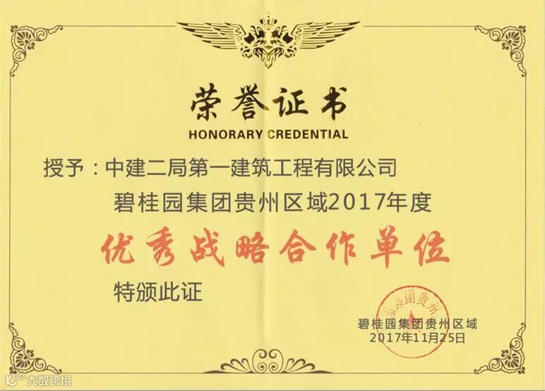 2017年 11月25日,碧桂园集团召开了贵州区域2017年供应商答谢会,公司喜获碧桂园贵州区域2017年优秀战略合作单位荣誉,深圳分公司第一项目经理部总经理花捷等代表公司接受了颁奖。