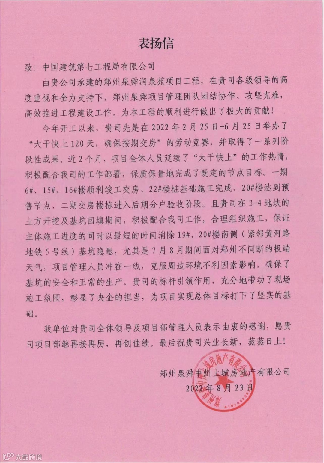 近日,郑州泉舜项目收到业主单位发来的表扬信,对项目团队在今年以来大干快上、保质保量完成既定节点目标进行了表扬。