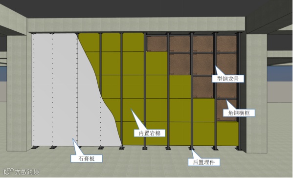 该工法主要使用预埋件、型钢龙骨、角钢横梁,挂件、瓷砖、石膏板、膨胀螺栓、镀锌自攻螺丝、隔音棉作为主体材料,采用焊接将型钢骨架固定于楼板及板顶(或梁底)后置埋件上形成支撑体系,一侧安装角铁作为干挂瓷砖的横梁,另一侧通过镀锌自攻螺丝将石膏板固定在型钢骨架上,实现墙面两侧不同装修风格。用岩棉填充于墙内形成整体性的轻质隔墙。具有轻质、保温、隔热、隔音、高强的力学性能。