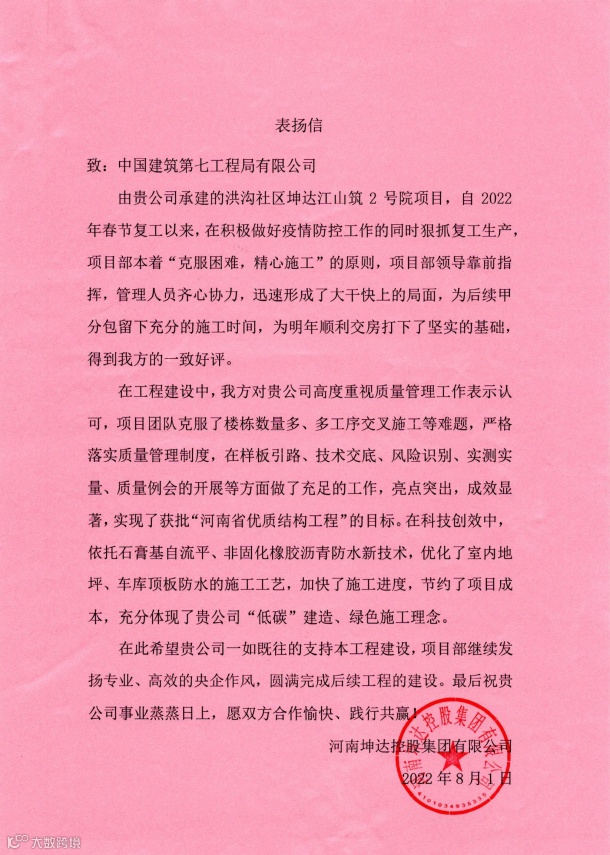 近日,坤达江山筑2号院项目部收到业主单位发来的表扬信,这也是一周内获得的第二封表扬信。据了解,工程建设过程中,项目团队克服了楼栋数量多、多工序交叉施工等难题,严格落实质量管理制度,在样板引路、技术交底、风险识别、实测实量、质量例会的开展等方面做了充足的工作,亮点突出,成效显著,实现了获批“河南省优质结构工程”的目标。下一步,项目团队将继续严格按照要求,牢固树立质量责任意识和底线意识,积极推进成果转化工作,助力公司高质量发展。