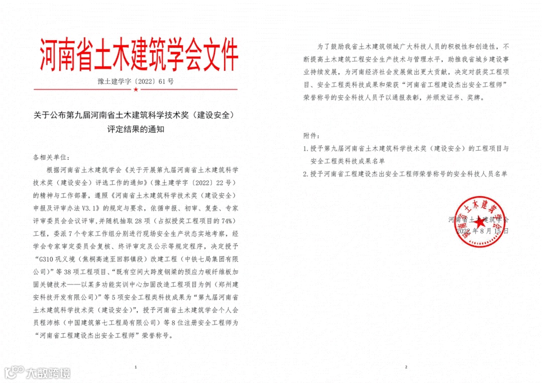 近日,河南分公司许昌市体育会展中心一期(体育场)项目、美的翰悦府项目荣获“2022年度第一批河南省建设工程施工安全生产标准化工地”;玖瑞名筑住宅(返乡创业示范园)项目、偃师市人民医院(新区医院)建设项目、周口一峰梦想城商业地块项目荣获第九届河南省土木建筑科学技术奖(建设安全)。截至目前,分公司今年已荣获国家级安全文明工地1项、省级9项、市级5项,创先争优成效显著。