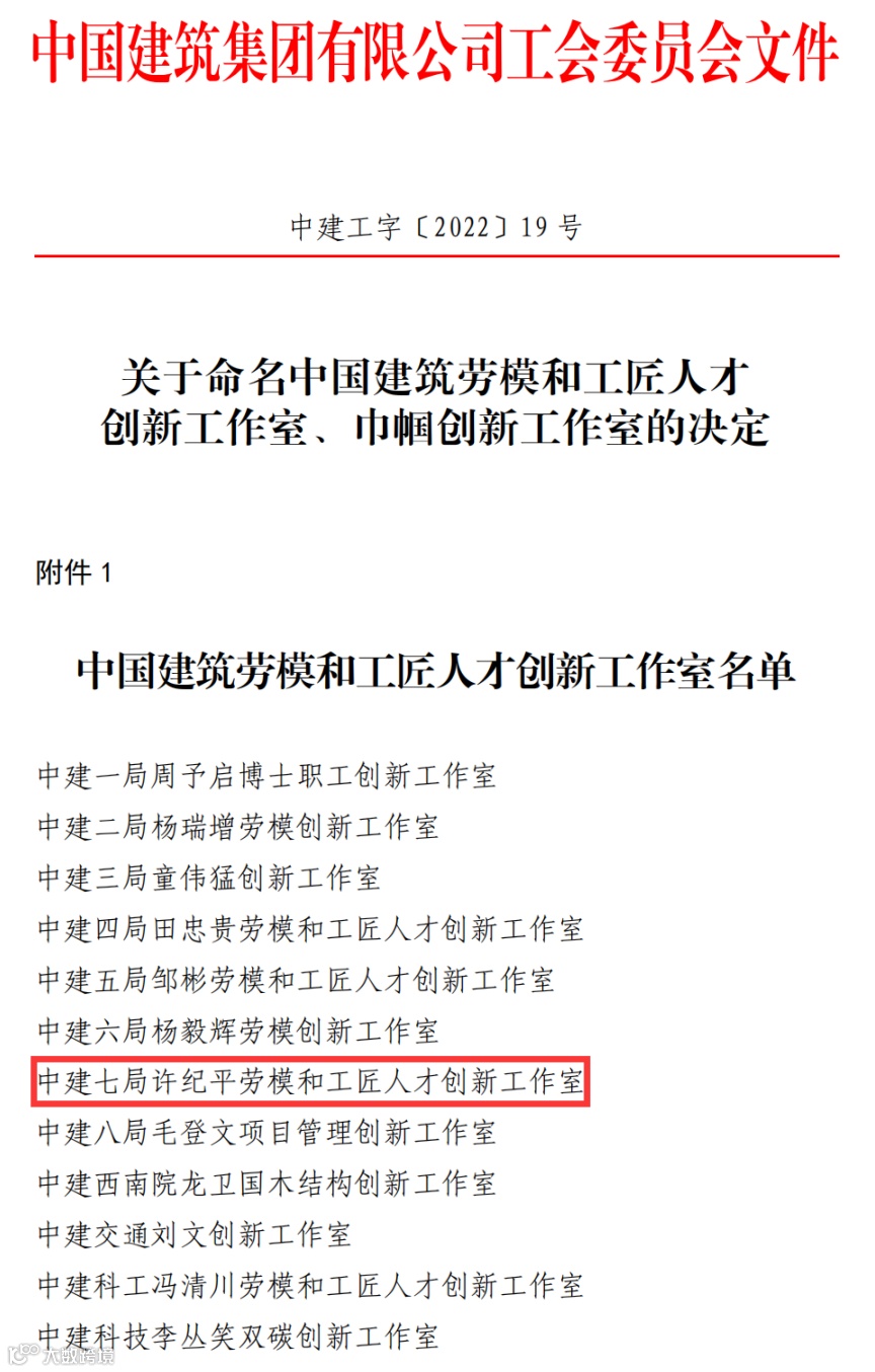 在工作室带头人许纪平和团队成员的共同努力下,许纪平创新工作室荣获2022年中建集团“劳模和工匠人才创新工作室”。