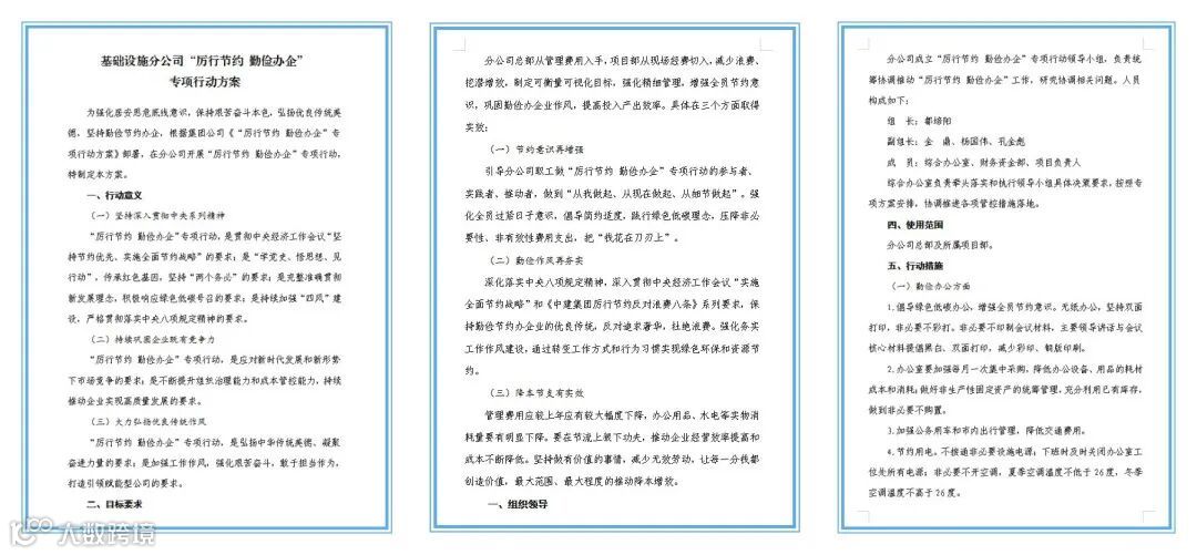 文件方案先行。制定“厉行节约 勤俭办企”专项行动方案,明确勤俭办公、节约用餐、节约办会、节约差旅、节约预算、加强宣传等措施,并将方案执行纳入员工日常行为规范,与部门年度绩效考核挂钩,做到细节落地、以点带面、全员行动。