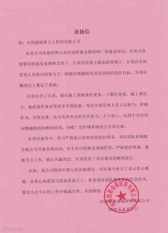 业主单位表扬信纷至沓来,项目驻地政府部门与周边群众的赞誉声接连不断,河南分公司始终如一匠心追求,以完美履约为“七局建造”品牌添彩。