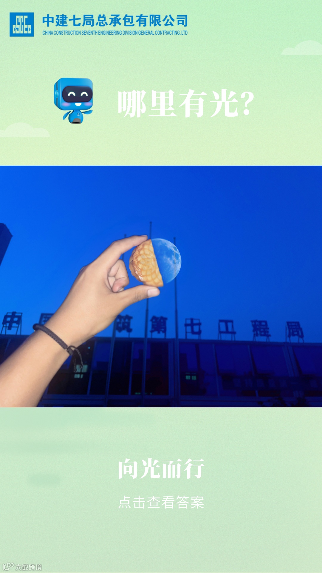 寒来暑往,披星戴月,随时穿梭在每个工区和楼层,中秋快到了,忙里偷闲来品个“月饼”!作为一名中建七局的工作者,希望自己能够脚踏实地,谱写自己的“蓝色人生”。