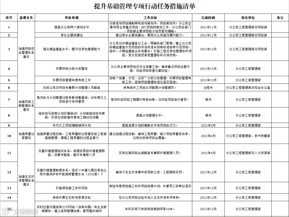 督促相关主责部门做好提升基础管理推进落实工作,督导综合办公室认真梳理岗位清单,明确工作职责,签订目标责任书5份,进一步明确职责和工作要求。针对综合管理、工期管理、质量过程管控、生态环保、劳务管理五方面任务,制定任务措施17项,目前已完成14项。