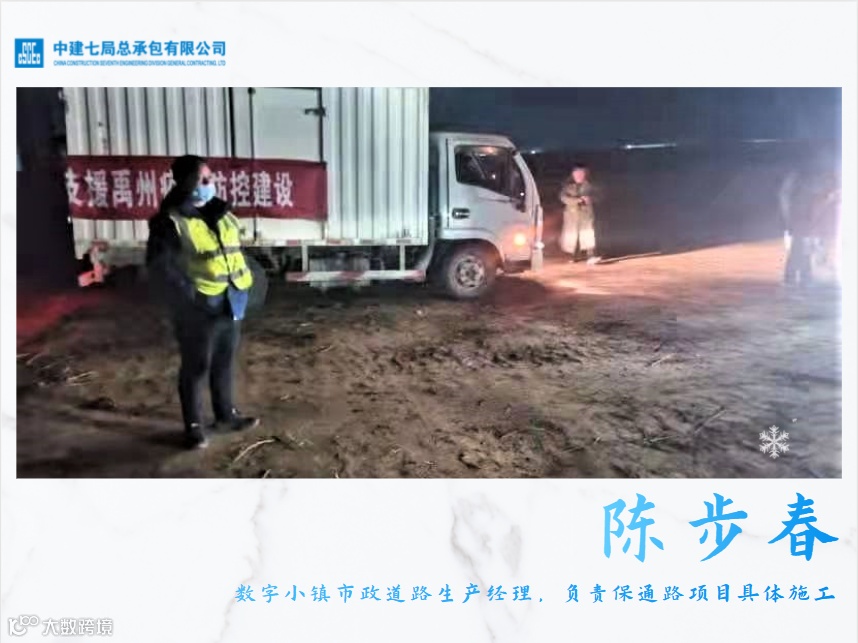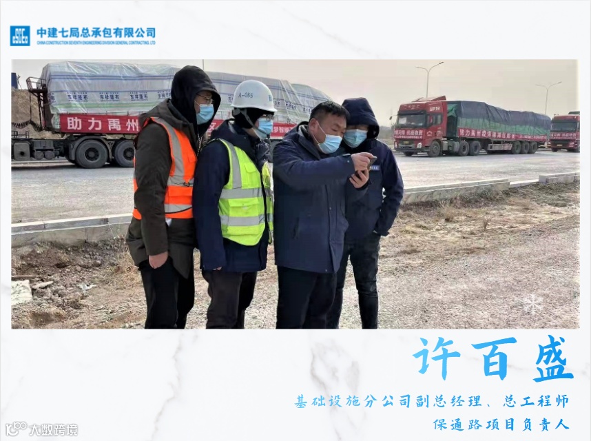 1月的禹州,夜晚的温度在零度以下,许百盛站在凛冽的寒风中,又紧了紧身上的军大衣,他已经3天没有好好休息,仅有的一次睡眠还是在车里。而时间一分一秒极速流逝,距离24小时务必修通保通路的时间结点,仅剩6个小时。作为中建七局援建禹州疫情临时流调观察点运送物资的唯一通道,保通路的修通意味着和生命赛跑。此时,摆在许百盛面前的难题是高压线、埋地电缆等如何有效快速处理。北风很大,不停地吹着许百盛的衣服、脸和头发,不时还有夜间工作的大卡车从他身边呼啸而过,灰尘呛得许百盛眼睛鼻子发痒。但他依然醉心于工作。这一夜,许百盛打了50多个电话,走了2万多步,只吃了一点白天剩下的白米饭。问题解决了,问他苦不苦、累不累、难不难的时候,他却自豪地说:“这样干,值了!”