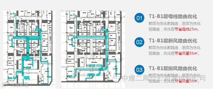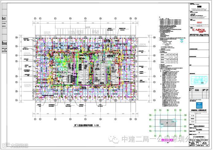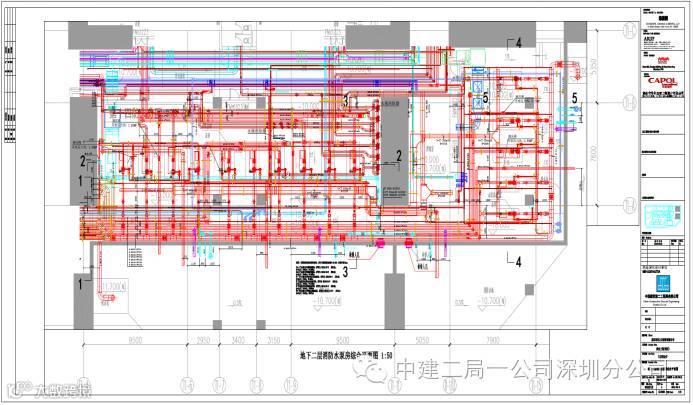 管线综合图 :管线综合平面图在BIM模型优化完毕后出图,出图后下发机电施工班组,作为现场的施工依据,综合图中反应了机电全专业的信息,图纸中对每条管线及设备均有详细的水平定位信息和标高信息,现场只需严格按图施工即可,不会出现专业间的管线打架碰撞问题。使现场各专业平行施工得以实现。