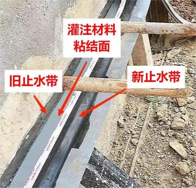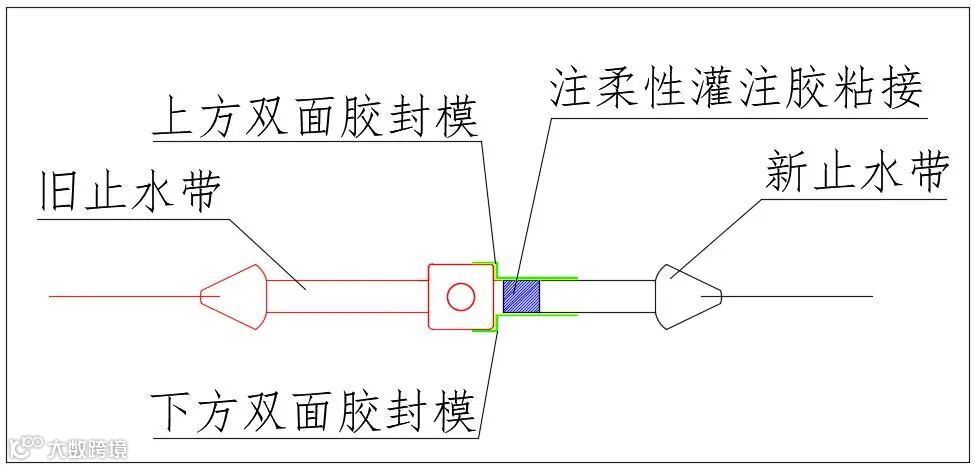 该发明原理为将破损的止水带用新止水带替换,新止水带与旧止水带之间采用一种注柔性高粘结防水材料粘接,在施工时新旧止水带采用对口粘接,对口间隙20mm,间隙内灌注高粘结防水材料,从而在新旧止水带结合面处充分利用灌注材料的高延伸性、防水性及高粘结性等优点,以防止在后期外力作用下止水带在结合面处被拉裂,从而提高使用寿命。