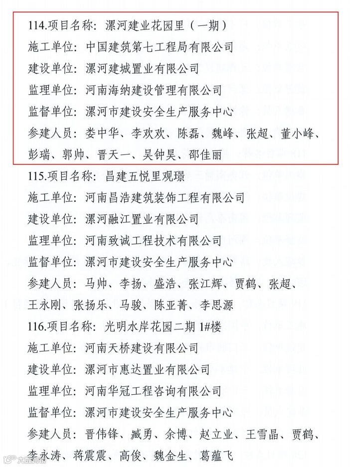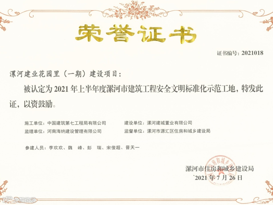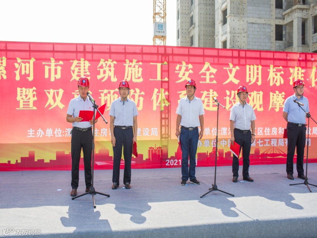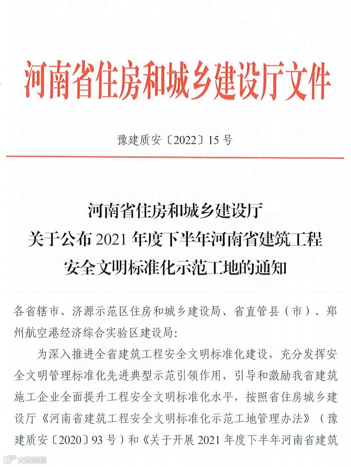 以公司《安全防护标准化图集》和《施工现场安全标准化观摩操作指引》为指引,引进安全科技设备,打造区域化观摩工地,先后举办市级安全标准化及双重预防体系建设观摩会了、区级防汛应急演练观摩会,获“漯河市2020年度扬尘污染治理工作先进集体”“2021年上半年度漯河市建筑工程安全文明标准化示范工地”等称号。