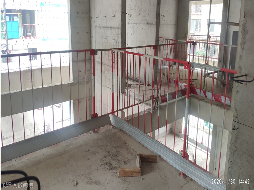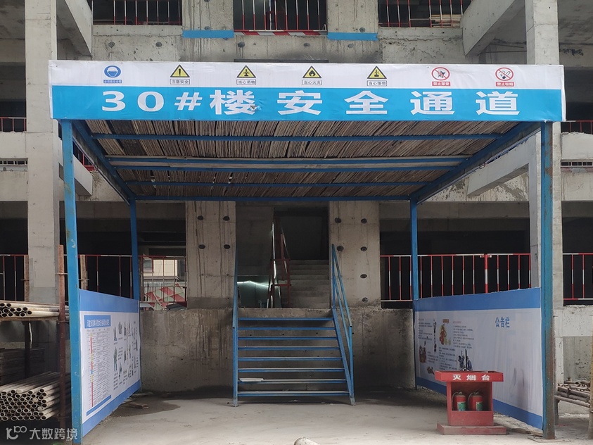 按照施工总平面布置图的要求,统一规划现场,材料分类码放整齐,标识清楚。基坑上下人行通道、楼层临边、楼梯临边、预留洞口、电梯井口、施工电梯防护门、木工加工棚、配电箱防护棚等均采用工具防护。钢筋加工区、施工电梯安全通道、安全通道做到“三棚合一”,现场消防安全以及外脚手架搭设等严格执行公司《施工现场安全防护标准图册》要求,悬挂统一的“平平安安”提示牌和安全警示牌。